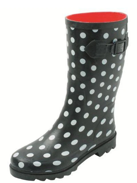 Bij regen en modderige paadjes kunnen een paar laarzen soms erg goed van pas komen. Waarom niet gelijk leuke laarzen? Deze dameslaars is gemaakt van rubber en daardoor 100% waterdicht en heeft een leuke uitstraling. Het zwart witte stippenpatroon en de rode binnenkant maken de laars uniek en leuk om naar te kijken. Ook heeft het een luxere afwerking met een gespje als detail. De laarzen zijn heel makkelijk aan- en uit te trekken vanwege de extra brede kuitwijdte. Beschikbaar in de maten 36-42.