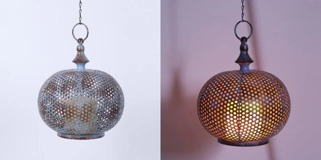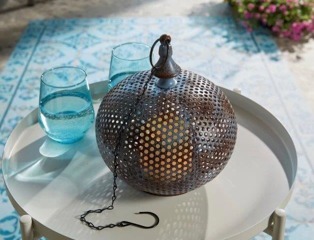 Een mooie unieke lamp in je huis of tuin creëert gelijk een prachtige sfeer! Zeker deze ronde Marokkaanse lamp met een brons/blauwe finish. Het unieke oriëntaalse motief zorgt voor een prachtige lichtval rondom de lamp wat zeker voor gezelligheid en sfeer zorgt! Deze lamp kan je neerzetten en gebruiken als tafellamp, of je kunt hem ophangen aan de ophangketting die eraan vast zit. De lamp is ook nog eens extra flexibel te plaatsen in huis, omdat je geen rekening hoeft te houden met een stopcontact in de buurt! De lamp heeft een 18650Li-ion 3.7V batterij die je makkelijk kunt opladen met USB met een aan/uit schakelaar onderop. Zo is hij bijvoorbeeld ideaal om rond je terras of balkon te plaatsen of gewoon binnen in huis! Zeker omdat je lamp makkelijk kunt oppakken aan het handvat wat erop zit. De kaars, die aan de binnenkant van de lamp is gemonteerd, heeft 24 amberkleurige vlammende LEDs. Hierdoor wordt een prachtig op en neer bewegend effect gecreëerd waardoor je het gevoel hebt dat er een echte kaars brandt! Ook is de lamp voorzien van een 6/18 uurs timer. Super makkelijk dus, en je hoeft je geen zorgen te maken om of de lamp wel uit is gezet. De lamp is gemaakt van metaal en kunststof. Afmetingen Damascus lamp: 200×230/400mm.